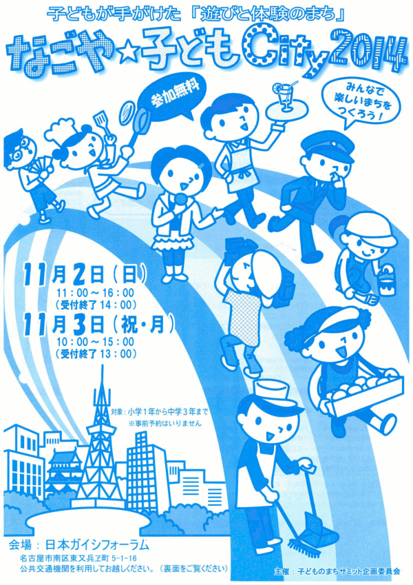 当イベントは、平成26年11月2日(日)と3日(祝日・月)の二日間で行われました。 来場者数も1日あたり約900人の子どもが参加しました。 会場では、様々なブースに分かれており、小さな町を作っていました。その中で働いたり買い物をしたりと さながら社会生活を疑似体験できる構造のなっており、大いに盛り上がりました。